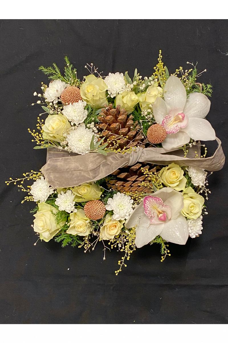 Dekorasjon lages i skål med friske blomster. Bildene er til inspirasjon. Har du ønske om farge, skriv gjerne dette som en kommentar til oss.