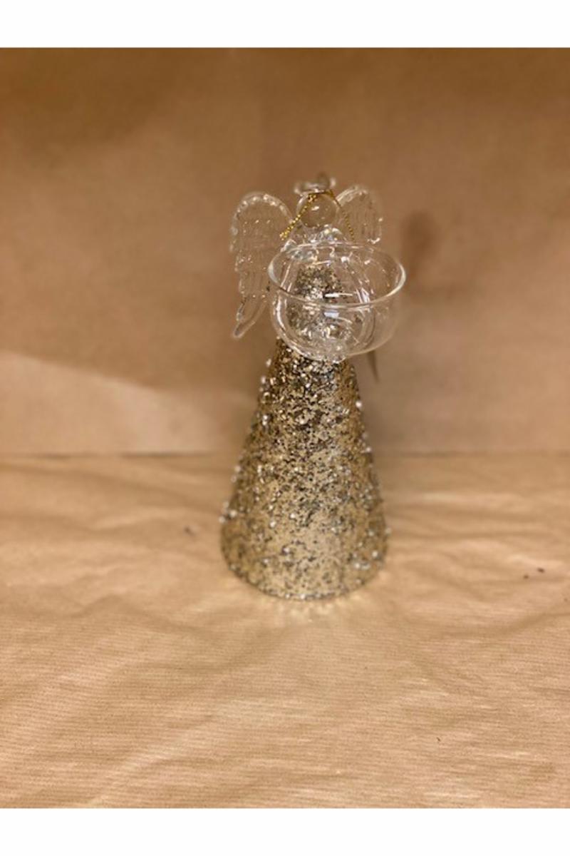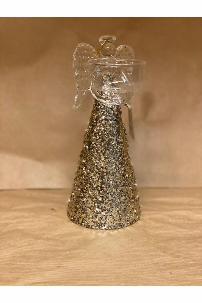 vakker glassengel til telys, med glitter skjørt.